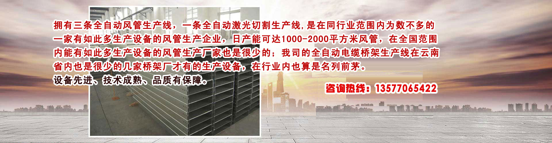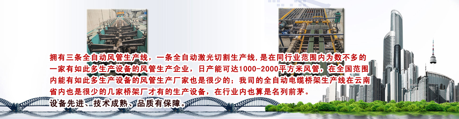 拥有三条全自动风���生产线�Q�一条全自动�Ȁ光切割生产线,是在同行业范围内为数不多的一家有如此多生产设备的风管生��企业�Q�日产能可达1000-2000�q�x���c�风���,在全国范围内能有如此多生产设备的风管生��厂家也是很少的;我司的全自动�늼�桥架生��U�在云南省内也是很少的几家桥架厂才有的生产设备,在行业内也算是名列前茅�?